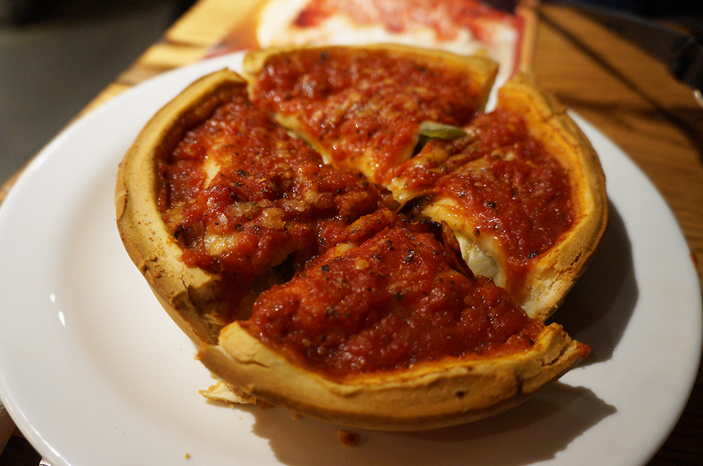 Totalmente diferente da pizza nova yorkina, em Chicago a deep dish pizza é o que faz sucesso.