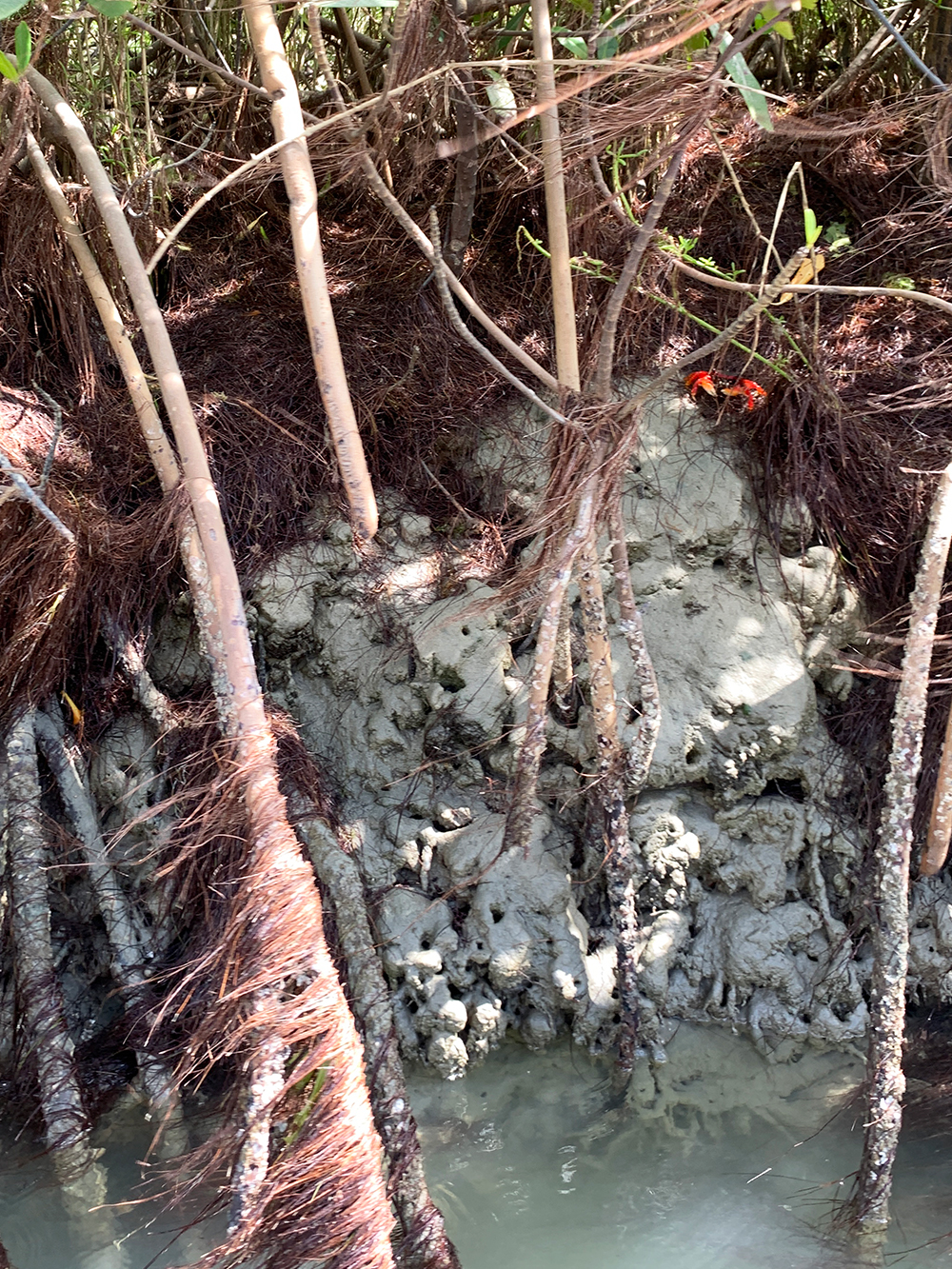Na foto abaixo, da esquerda, conseguimos ver um caranguejo vermelho no mangue. Vimos vários! Por eles serem vermelhos eles acabam se destacando. Já na foto da direita, um cavalo marinho!