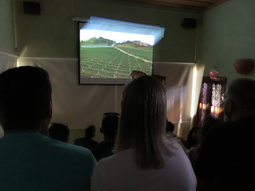 Depois seguimos até uma sala onde passaram um vídeo com um pouco da história da Villa Francioni (foto da esquerda). Em seguida, percorremos a vinícola (foto do meio)A construção da Villa Francioni tem 5 andares e o desnível facilita o fluxo do vinho.