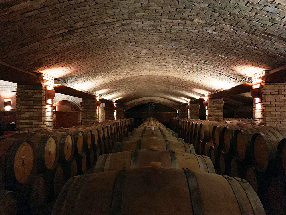 Finalizamos na cave (foto da direita), que fica a 4 metros abaixo do nível da entrada da vinícola. A Villa Francioni produz em torno de 150/160 mil garrafas por ano.