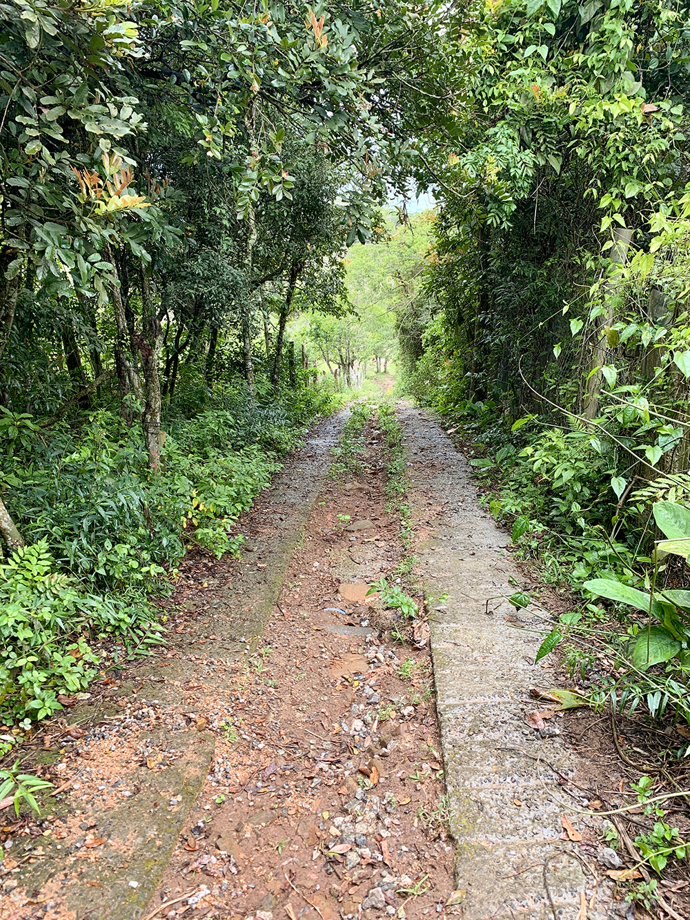 Do centrinho até a hospedaria das Brisas dá mais ou menos 10 minutos caminhando. Da Hospedaria das Brisas até o início da trilha são mais ou menos 15 ou 20 minutos de caminhada, morro acima. Esse é o trecho mais íngrime da caminhada, mas a via é toda pavimentada.