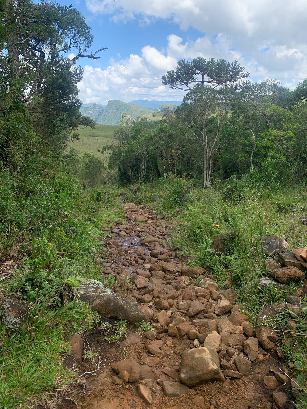 Depois de um tempo, quando eu não avistava mais as bandeirinhas de sinalização, eu acabei seguindo um guia da Casa do Turismo Urubici que estava fazendo a trilha com um casal.