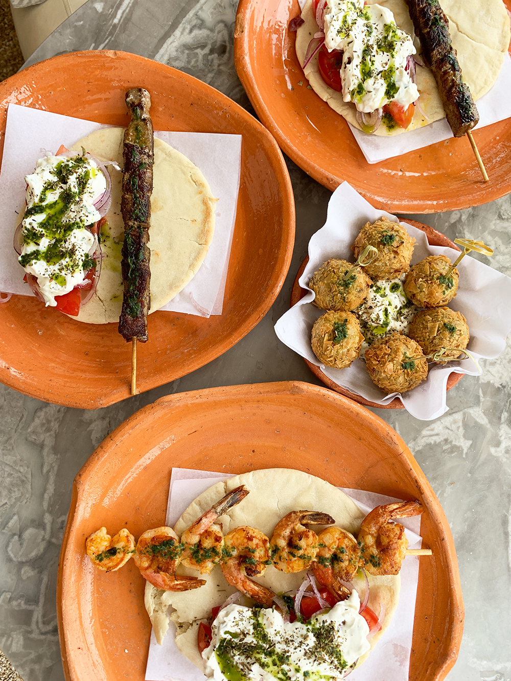 Nós optamos por pedir algumas entradas: Souvlack (espetinho temperado à moda grega, pão pita, tomate, cebola e molho tzatziki) de camarão (R$59) e de filé mignon (R$42) e um bolinho perfeito de cordeiro com purê de abóbora e molho de iogurte (R$ 34). Maravilhosos!